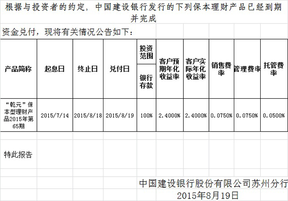 中国建设银行苏州分行保本理财产品2015年第65期理财产品兑付公告
