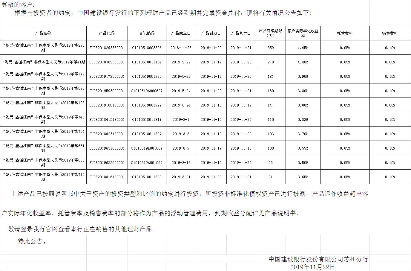 中国建设银行理财产品终止及清算公告