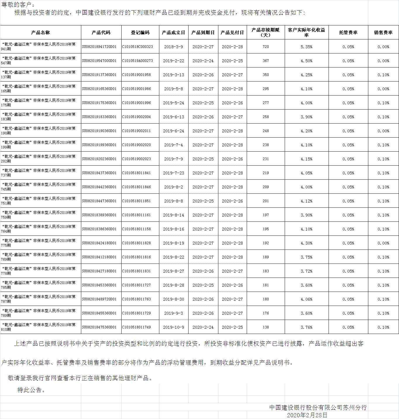中国建设银行理财产品终止及清算公告